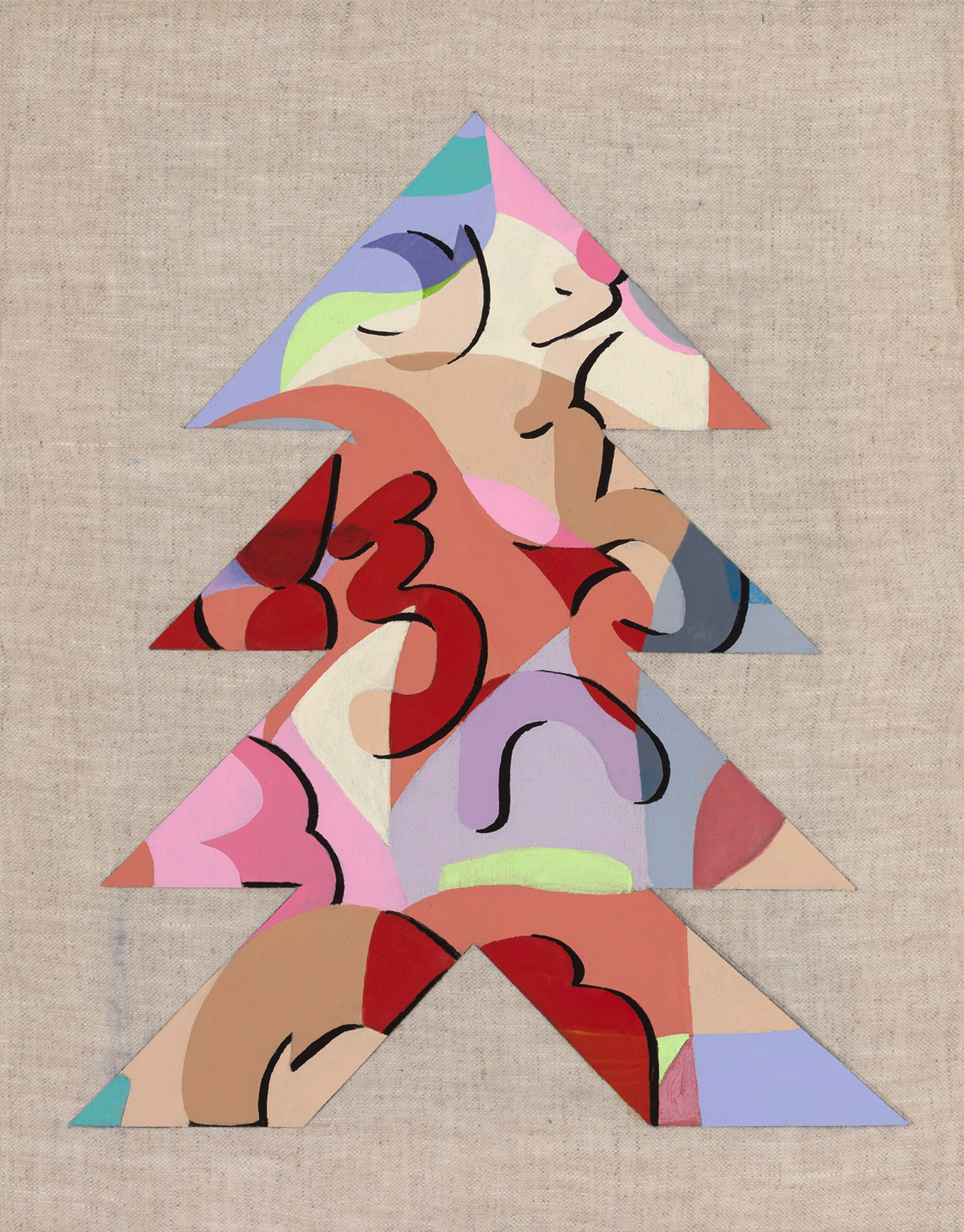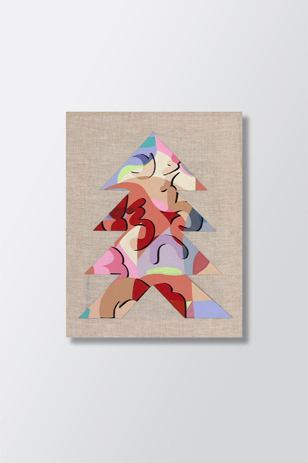 Part of a series of works I made combining the silhouette of an evergreen tree with abstract imagery. Having grown up in the Pacific Northwest, the evergreen is a symbol of home for me. Additionally, much of my work involves making shaped stretcher bars, and I later completed a shaped structure using this same shape.