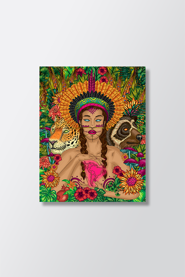 Latin Roots is a visual representation of the beauty of Latin Culture. The piece uses South American nature and pre-colonial elements as a focus for its composition. The piece highlights Latin American native tribes' history/importance and also invites the viewer to consider the impact that his/her actions are having on the wellness of the natural territories.