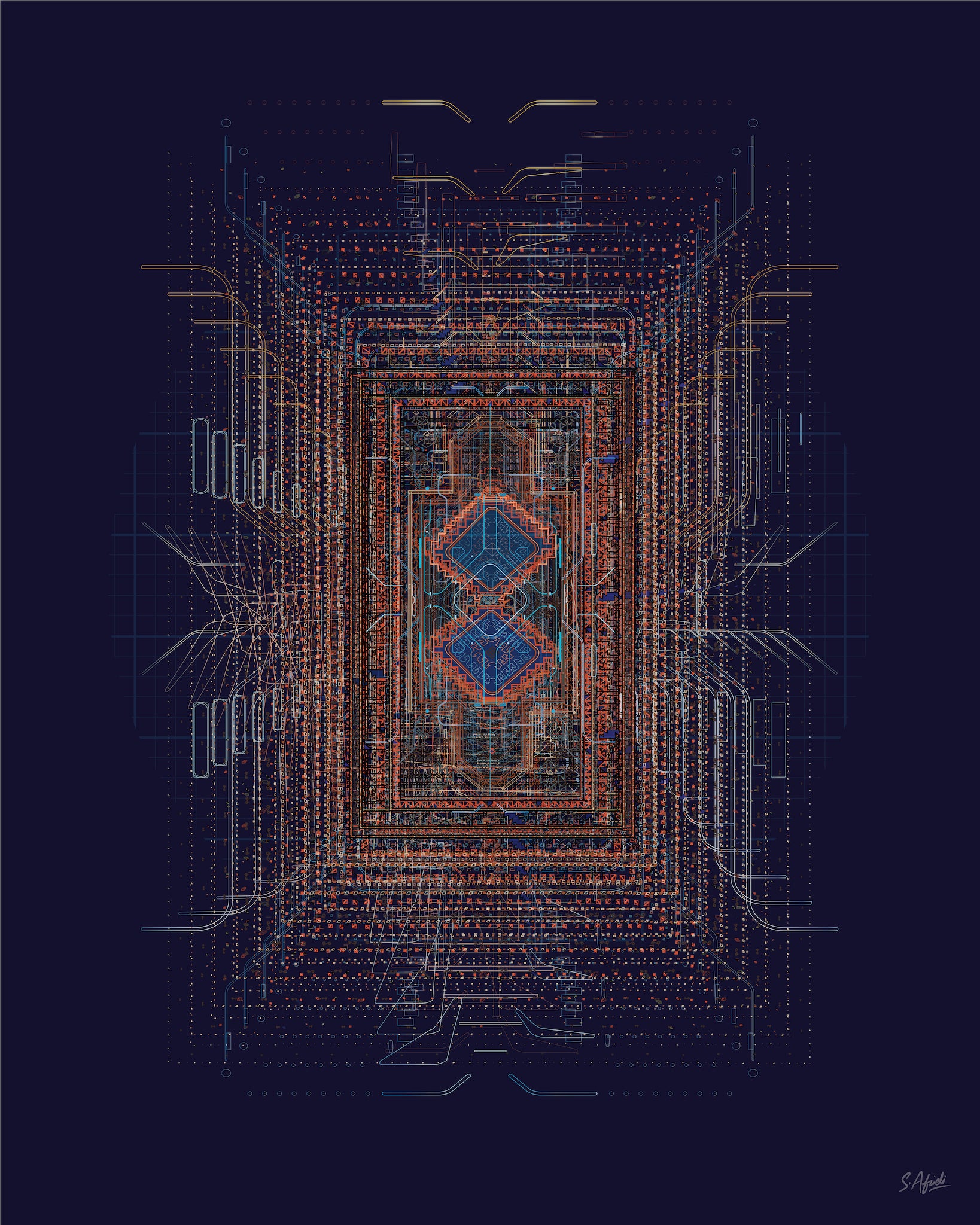Saks Afridi is a Pakistani-born, NYC-based multi-disciplinary artist. His work exists in a genre he terms “Sci-Fi Sufism,” which is about discovering galaxies and worlds within yourself. Afridi visualizes this search by fusing mysticism and storytelling. He makes art objects in multiple mediums, drawing inspiration from Sufi poetry, Afrofuturism, South Asian folklore, Islamic mythology, science fiction, architecture and calligraphy.